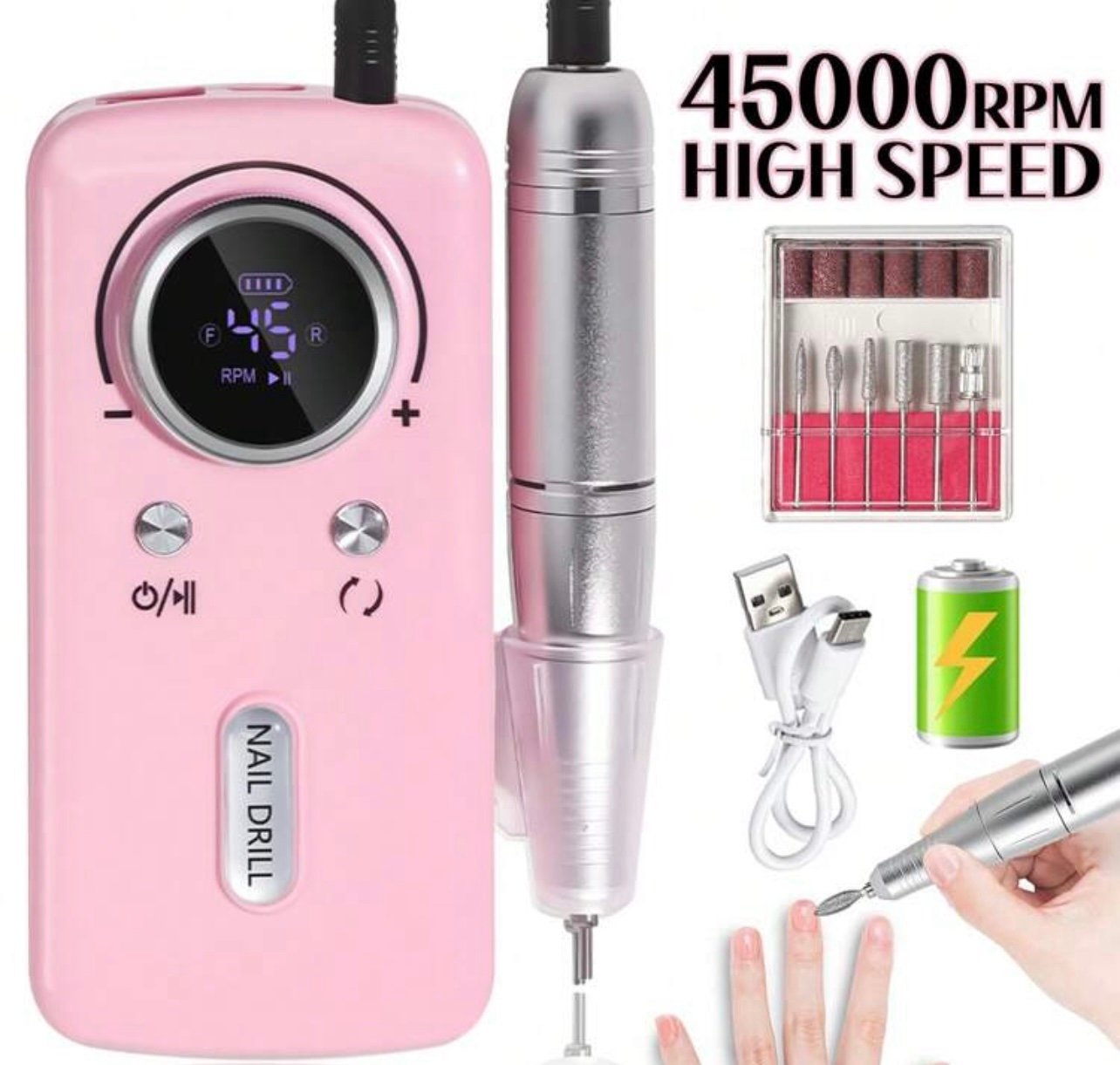Juego de máquina de taladro para uñas de 45,000 RPM para uñas de acrílico y gel, herramientas eléctricas para uñas profesionales recargables y portátiles, juego de lima de uñas y manicura/pedicura